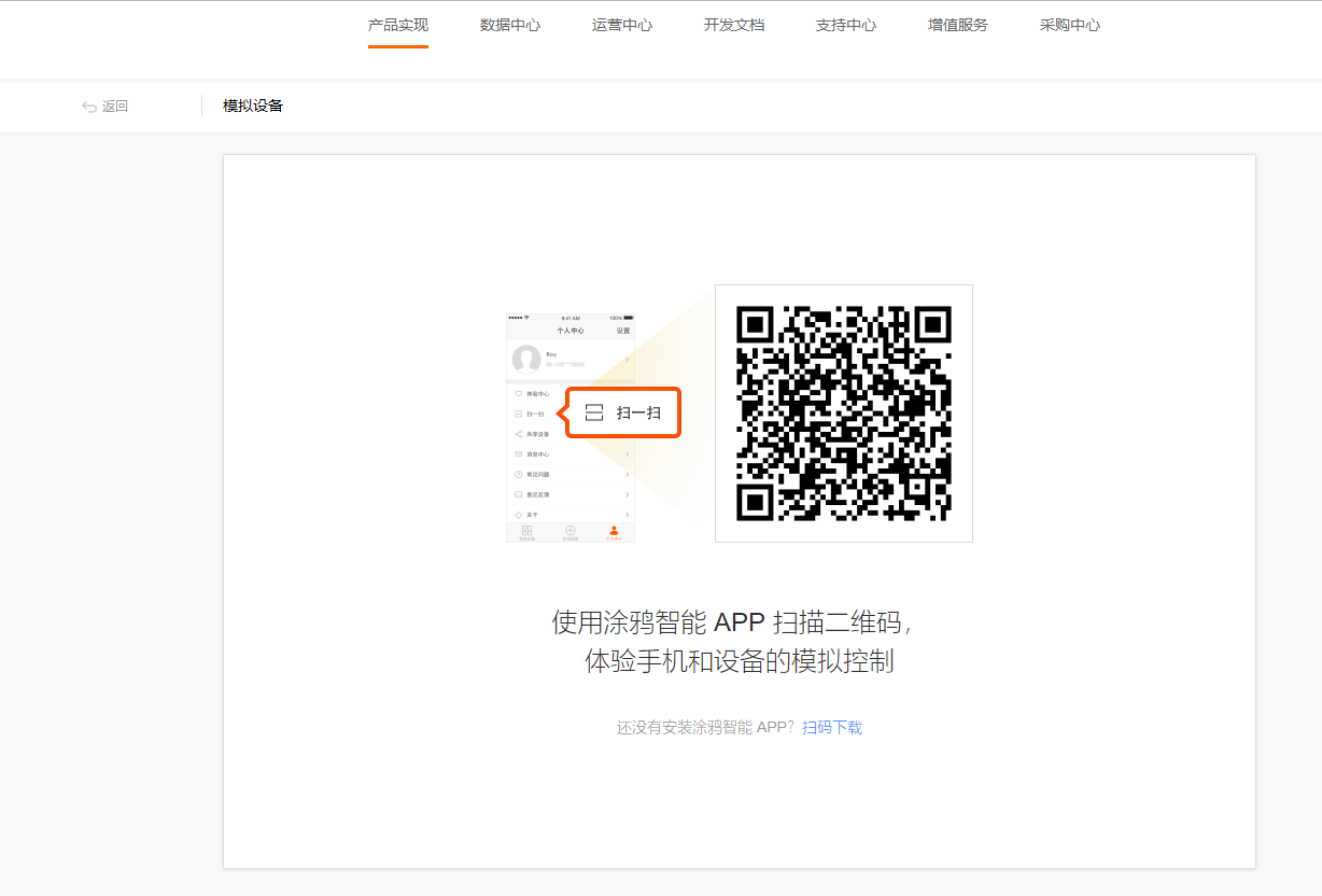 点击 虚拟设备调试,再用涂鸦智能 App 扫描二维码,即可进行在线调试。