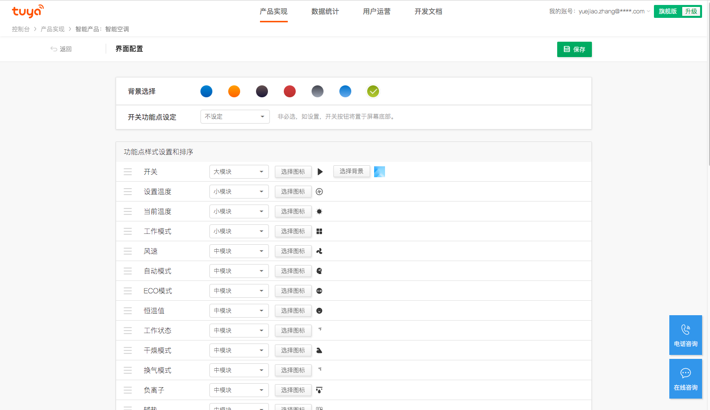 自由配置模板的配置方式是,为每个产品功能配置一种形状的组件,目前提供大模块、中模块、小模块等样式,系统会自动适配功能的类型,不同功能类型的指令下发上报亦不同。