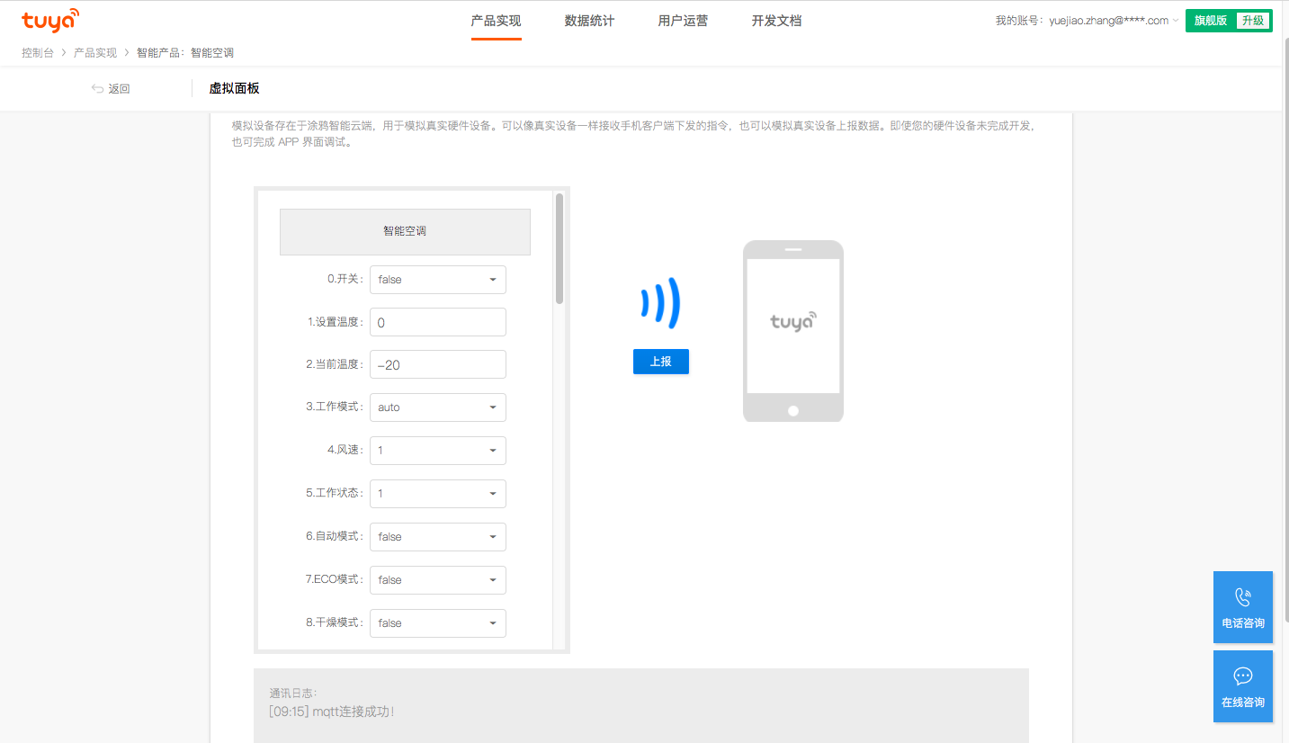 在虚拟面板页面支持查看通讯日志。如果您的产品还在调试阶段,亦可使用开发调试模板进行测试。开发调试模板支持展示所有产品功能及全功能类型。但是不建议将该类型界面发布给用户使用。